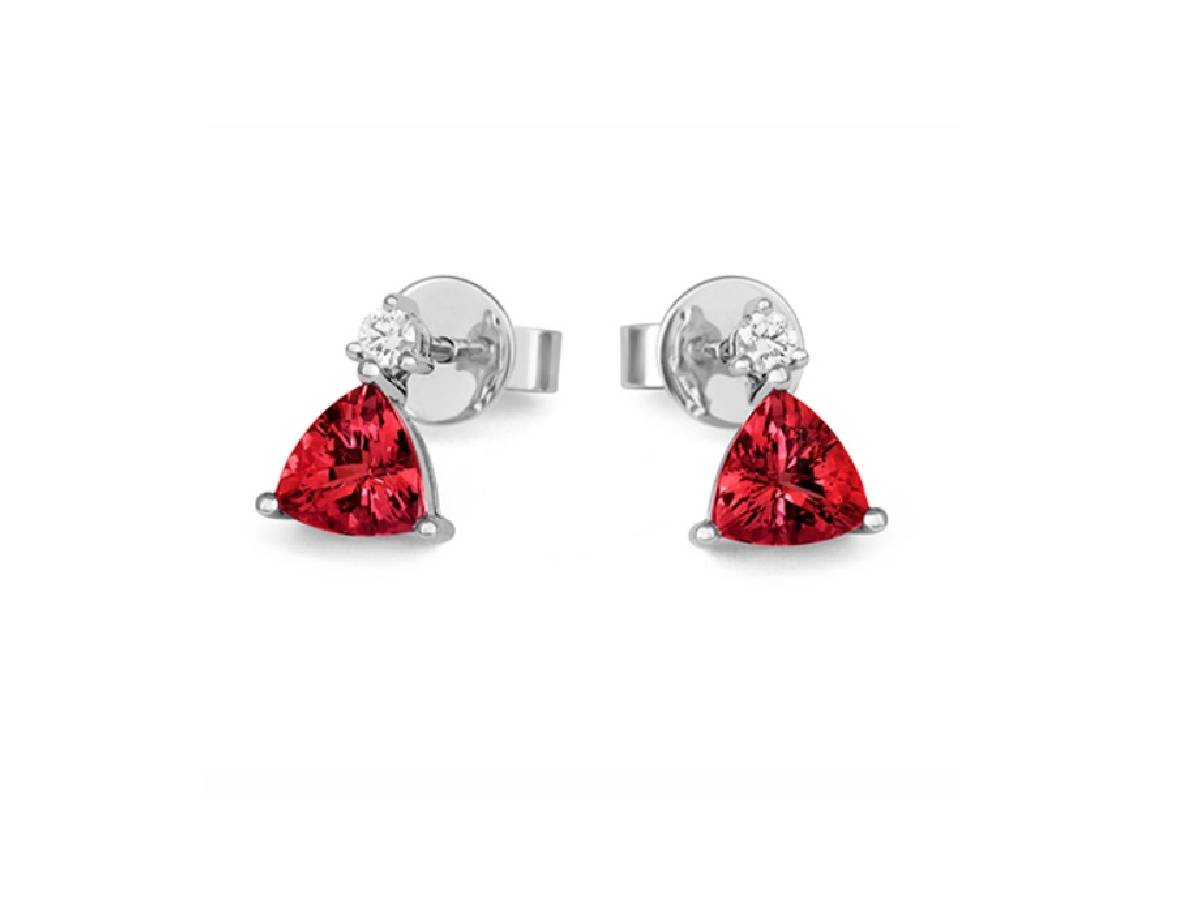 18ct white gold stunning trillion cut vibrant pink rubelite and diamond earrings with single brilliant cut diamond above, 3 claw setting with posts and scroll fittings.