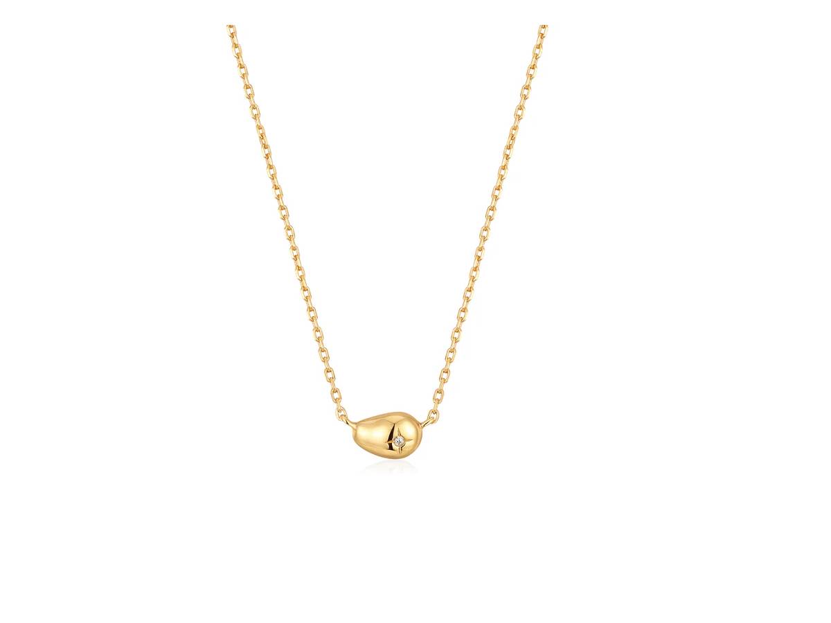 An elegant pebble-inspired unique-shaped pendant, complete with a single sparkling cubic zirconia stone, set on a delicate trace chain. Also available to order in silver.