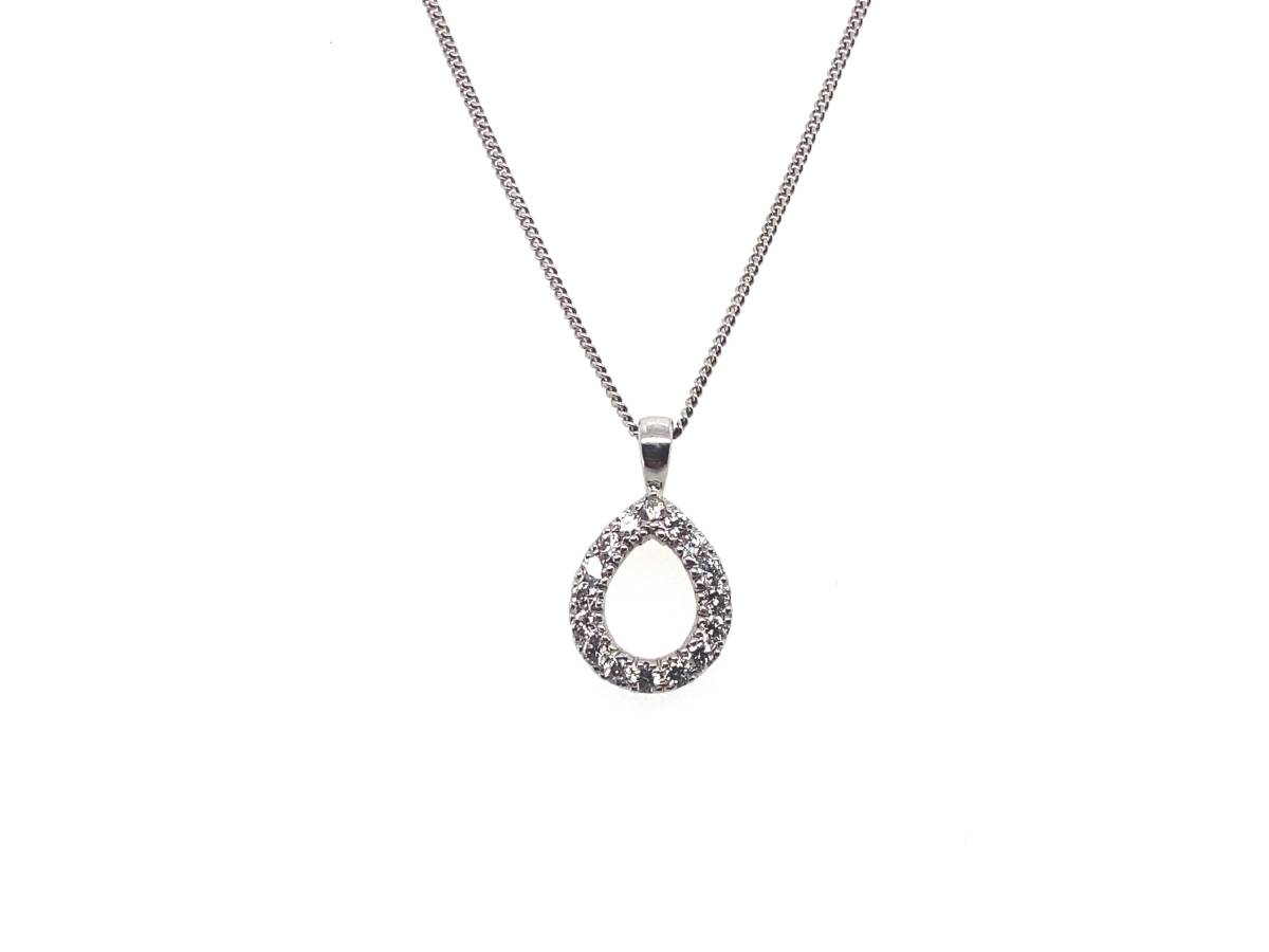 A beautiful open pear shape diamond pendant, complete with brilliant cut round diamonds set by double claws on a 16″ fine curb chain with a polished loop.