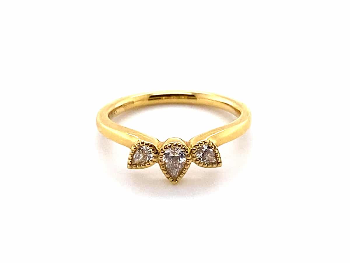 18ct yellow gold ring with comprising centre pear cut diamond with one smaller on each side and milgrain edges.