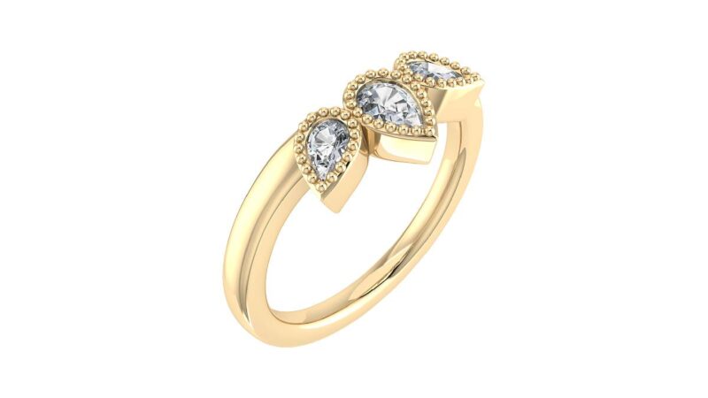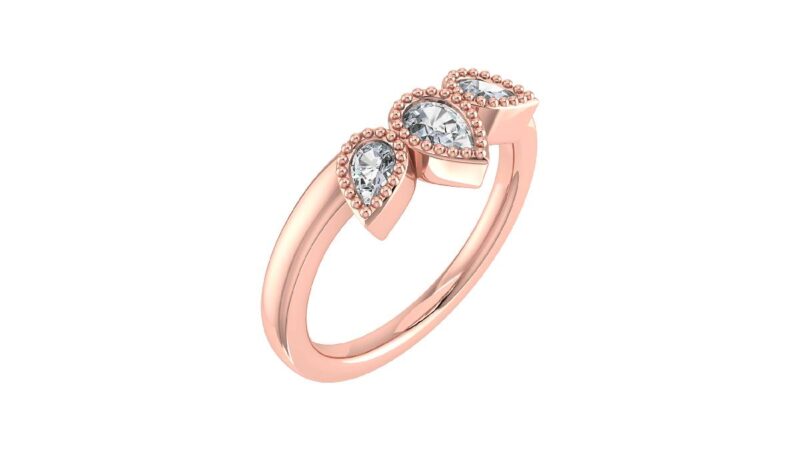 This gorgeous wedding ring features a three stone design with elegant pear cut diamonds on a 5.5mm band. The centre diamond is slightly larger than the others and positioned to create a tiara effect. All three diamonds are milligrain set.