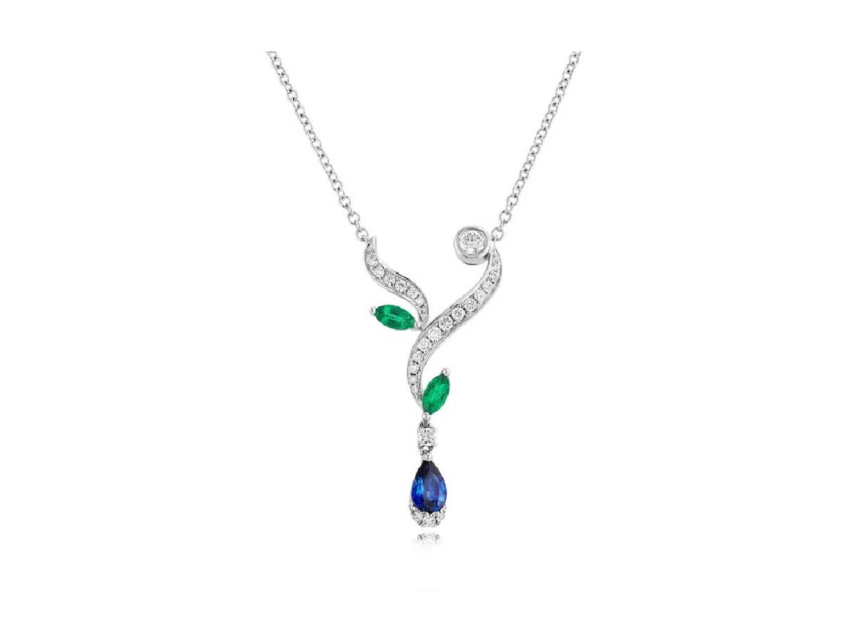 Comprised of a pear shaped sapphire at the base, followed by two claw set emeralds and 22 diamonds on vines all graduated grain set on a 15” razce chain.