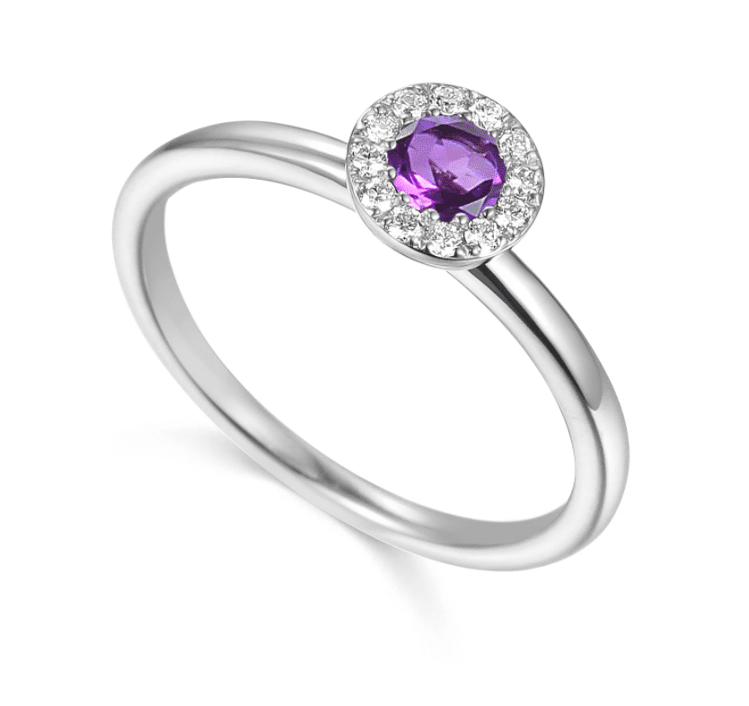 18ct white gold ring. Comprising central round Amethyst, surrounded by brilliant cut diamonds, micro claw set.
