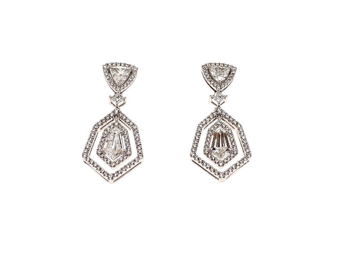 These spectacular earrings are an absoloute showstopper! Comprising of 4 different cuts of Diamond and totalling a huge 2.85ct. Featuring a gorgeous Kite cut central Diamond, surrounded by and mixture of Princess, Trillions and Brilliant cut Diamonds, set in 18ct White Gold.