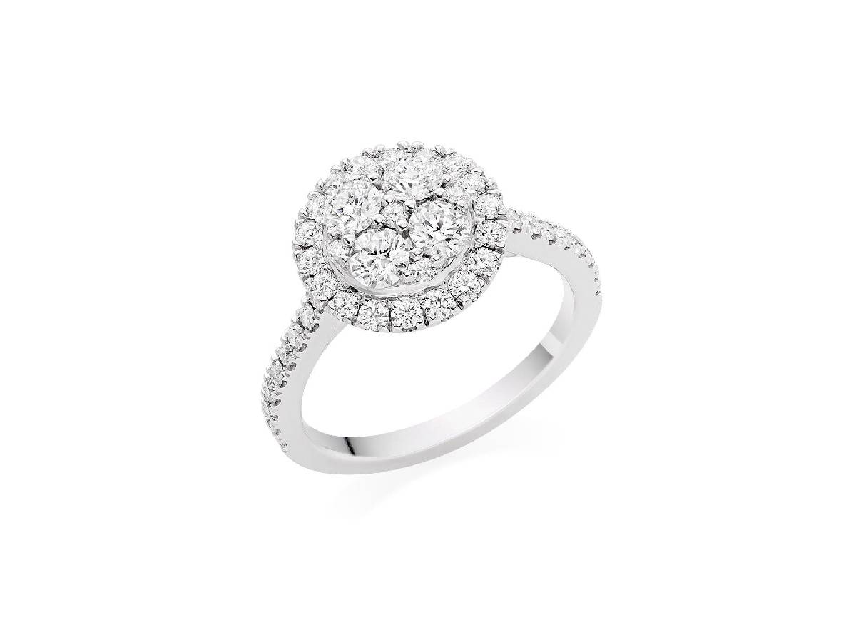 A stunning and sparkly 18ct white gold Diamond illlusion cluster ring with a Diamond halo and Diamond set shoulders.