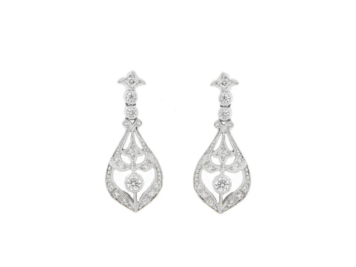 Intricate and unique, these art deco inspired drop earrings feature brilliant cut natural diamonds, all milligrain set and encased in a thoughtful design. With a shimmering finish and secure stud fastening, they offer complete elegance.
