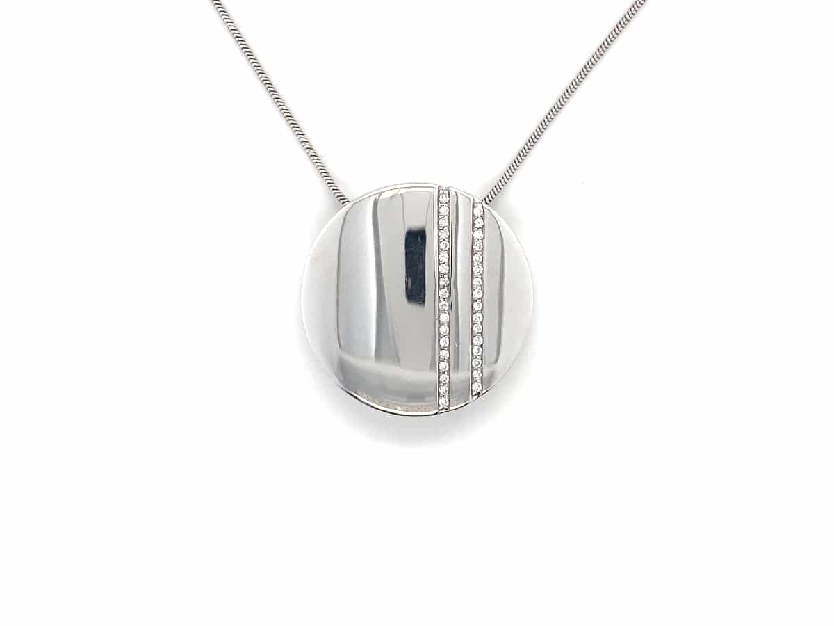 18ct white gold Diamond disc pendant on 16 inch snake chain.