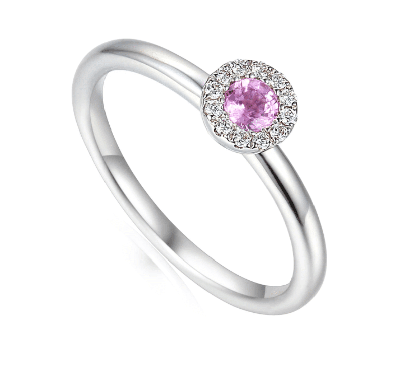 Comprising central round Pink Sapphire, surrounded by brilliant cut diamonds, micro claw set.