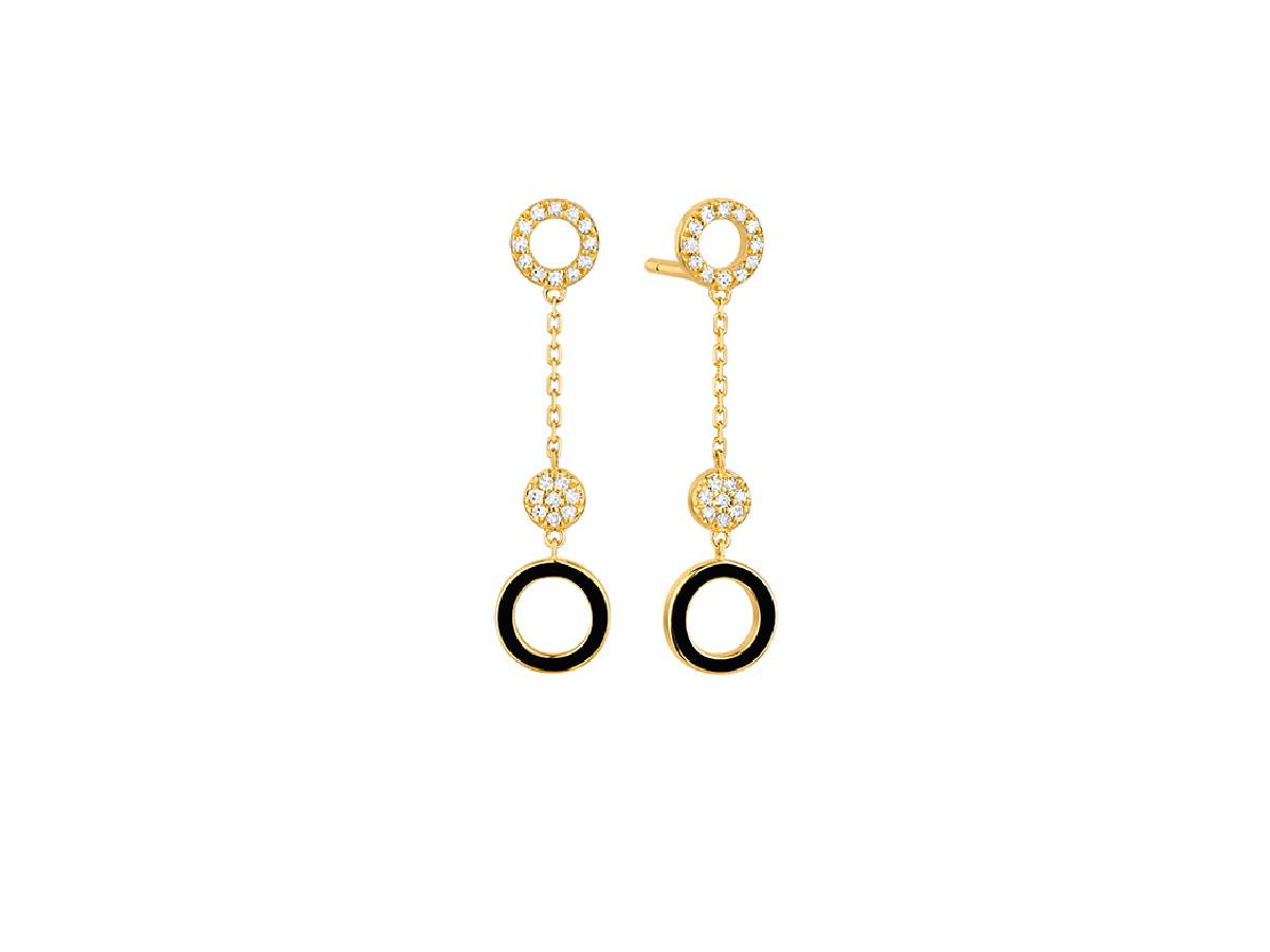 These stunning 18ct Yellow Gold drop earrings feature 72 round brilliant cut Diamonds, paired with striking black enamel. With a total of 0.20ct Diamonds, these double sided drop earrings sparkle beautifully in the light.