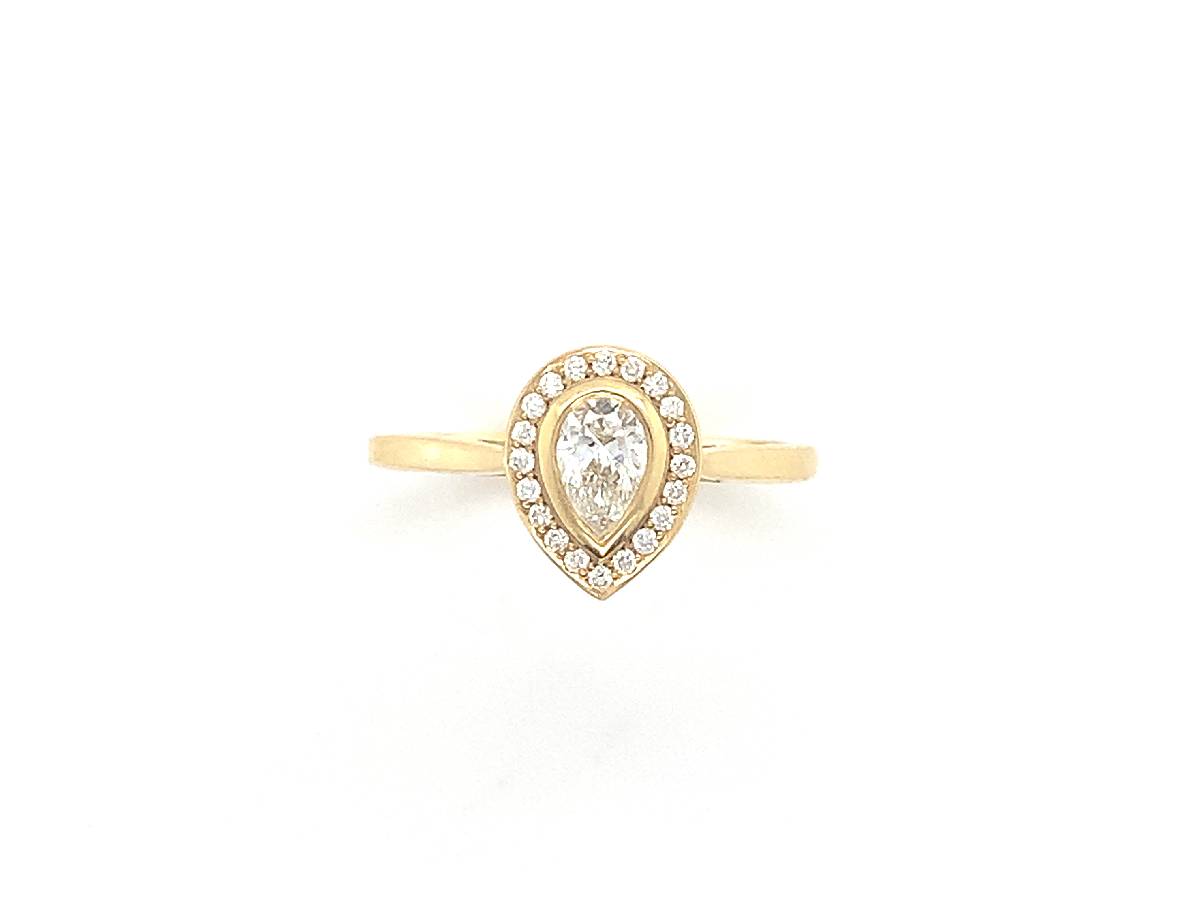 A stunning pear shaped Diamond cluster halo ring, with a central pear Diamond in a rubover setting, surrounded by x20 round brilliant cut Diamonds in a grain setting.