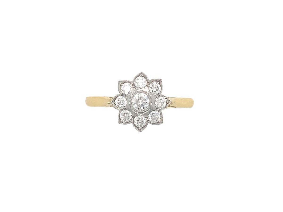 18ct yellow and white gold flower design cluster ring with pear shaped petals and round brilliant cut Diamonds in a milgrain edge setting.