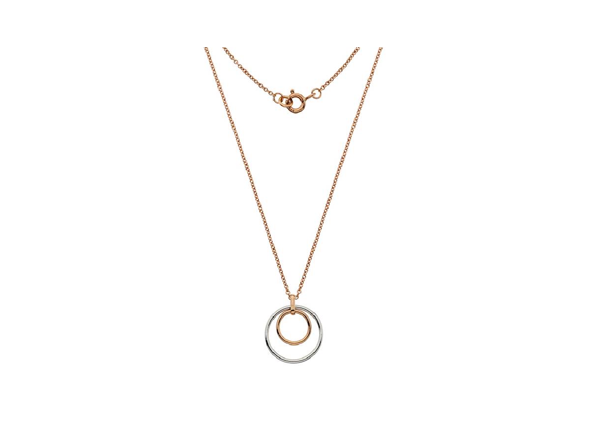 Comprised of one rose gold inner circle surrounded by white gold outer circle on an 18” chain.