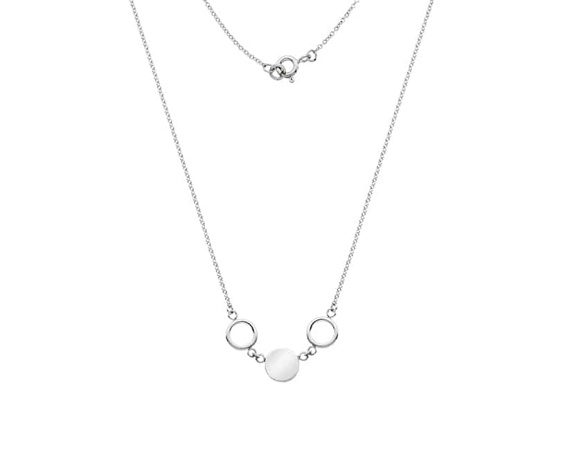 Three disk design necklace comprising one central solid circle shape and two open circles attached to a trace chain. Total length 18in with a adjuster loops at 16in.