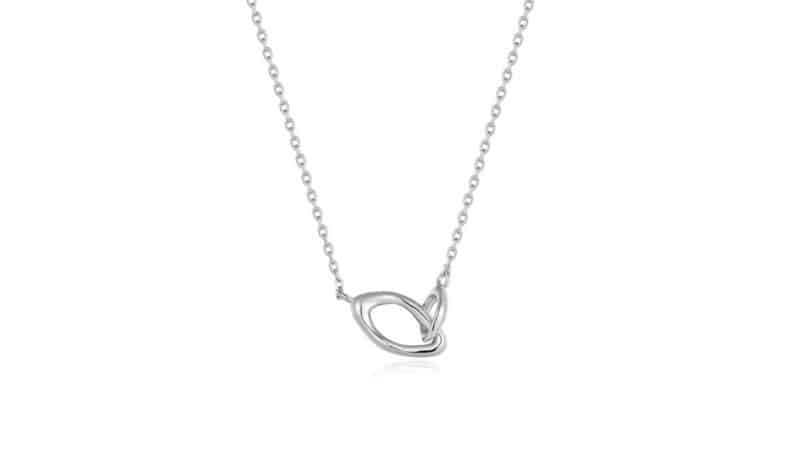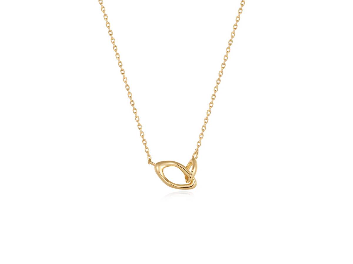 A contemporary link chain necklace inspired by ocean waves and the fluid form of liquid metal, you’ll find an asymmetrical pair of links set on a delicate gold trace chain. Also available in silver.