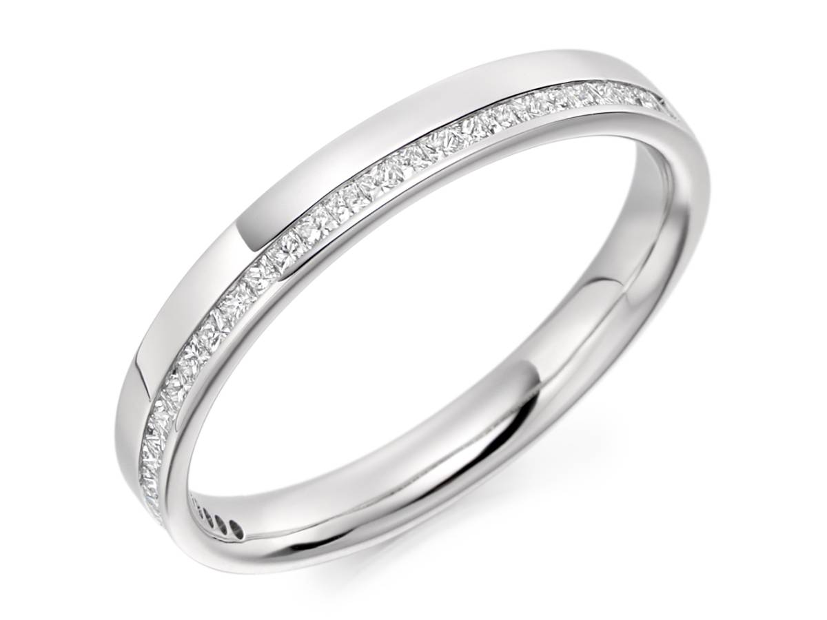 Platinum, Princess cut Diamond off centre design with a channel setting ring.