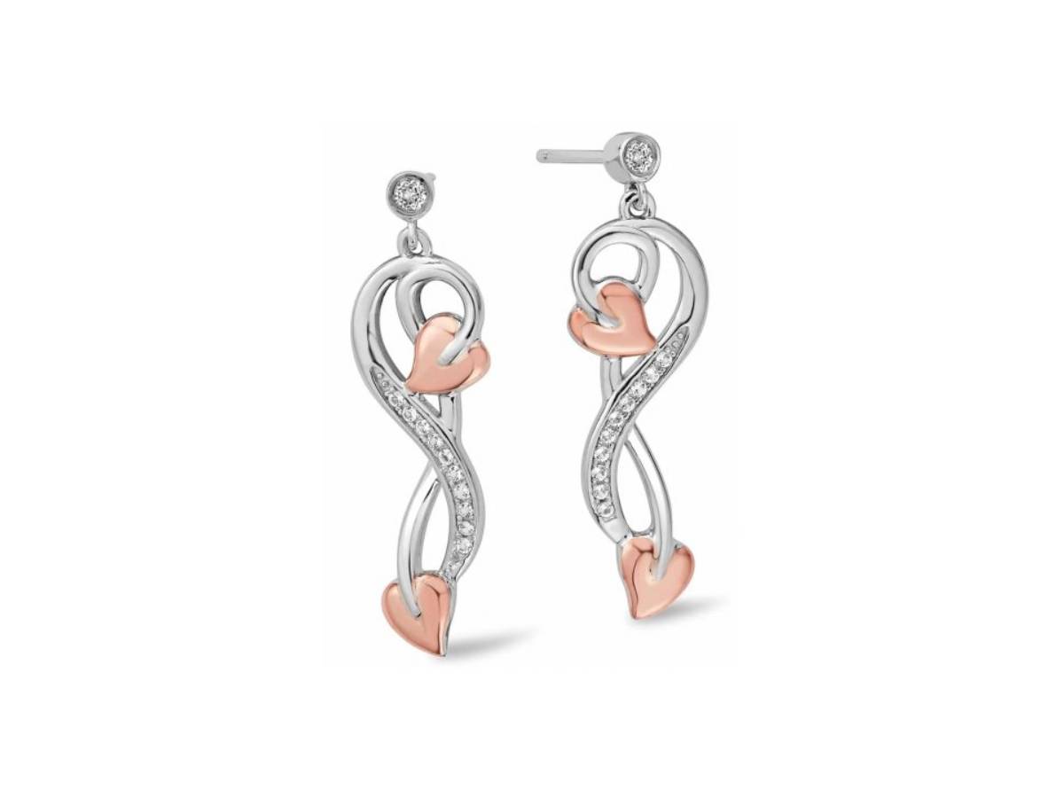The Tree of Life Silver Vine Drop Earrings express those ideas through an organic sterling silver setting with warm 9ct rose gold leaf accents. A band of white topaz gemstones gives the earrings a sparkling finish.