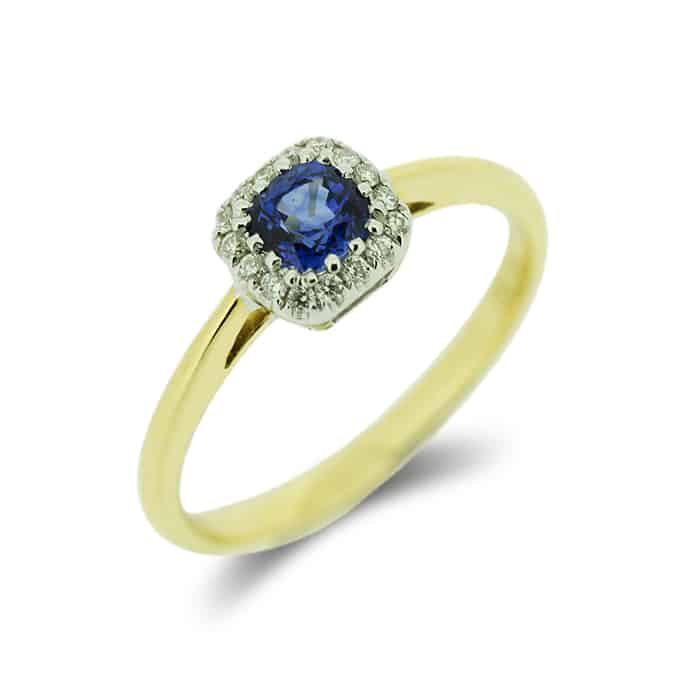 18ct yellow & white gold cushion cut Sapphire & Diamond cluster ring, claw set.
