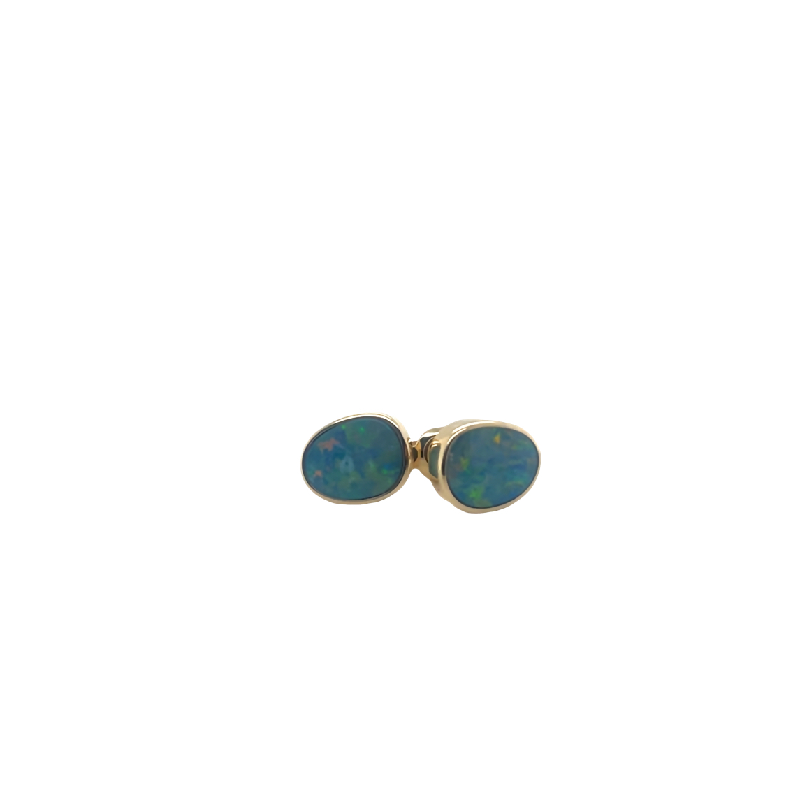 Comprising Doublet Opal, showing beautiful bright blues, yellow and orange flecks. Set in 9ct gold with a rubover edge. Open Back showing brown ironstone, posts and butterflies.