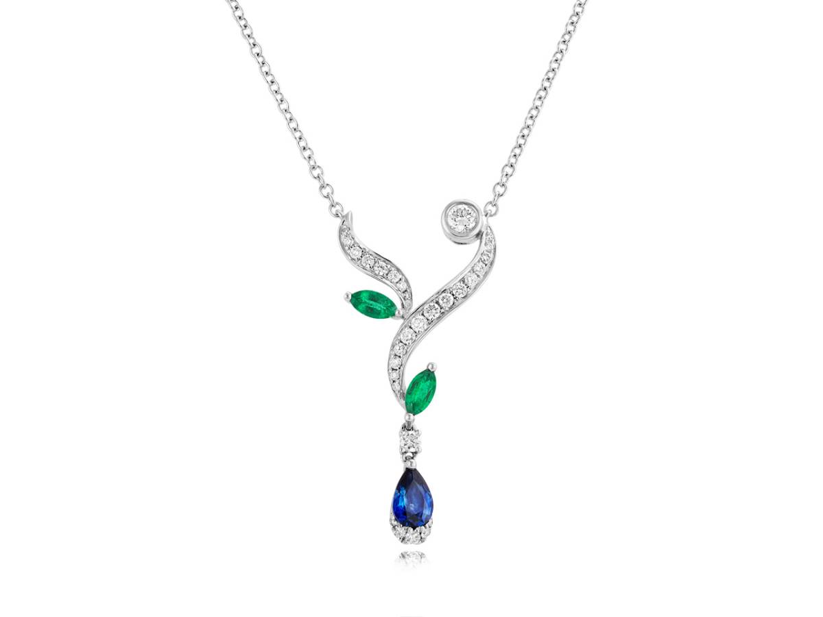 Comprising pear cut Sapphire at base, two marquise Emeralds and multi brilliant cut Diamonds on trace chain 42cm.