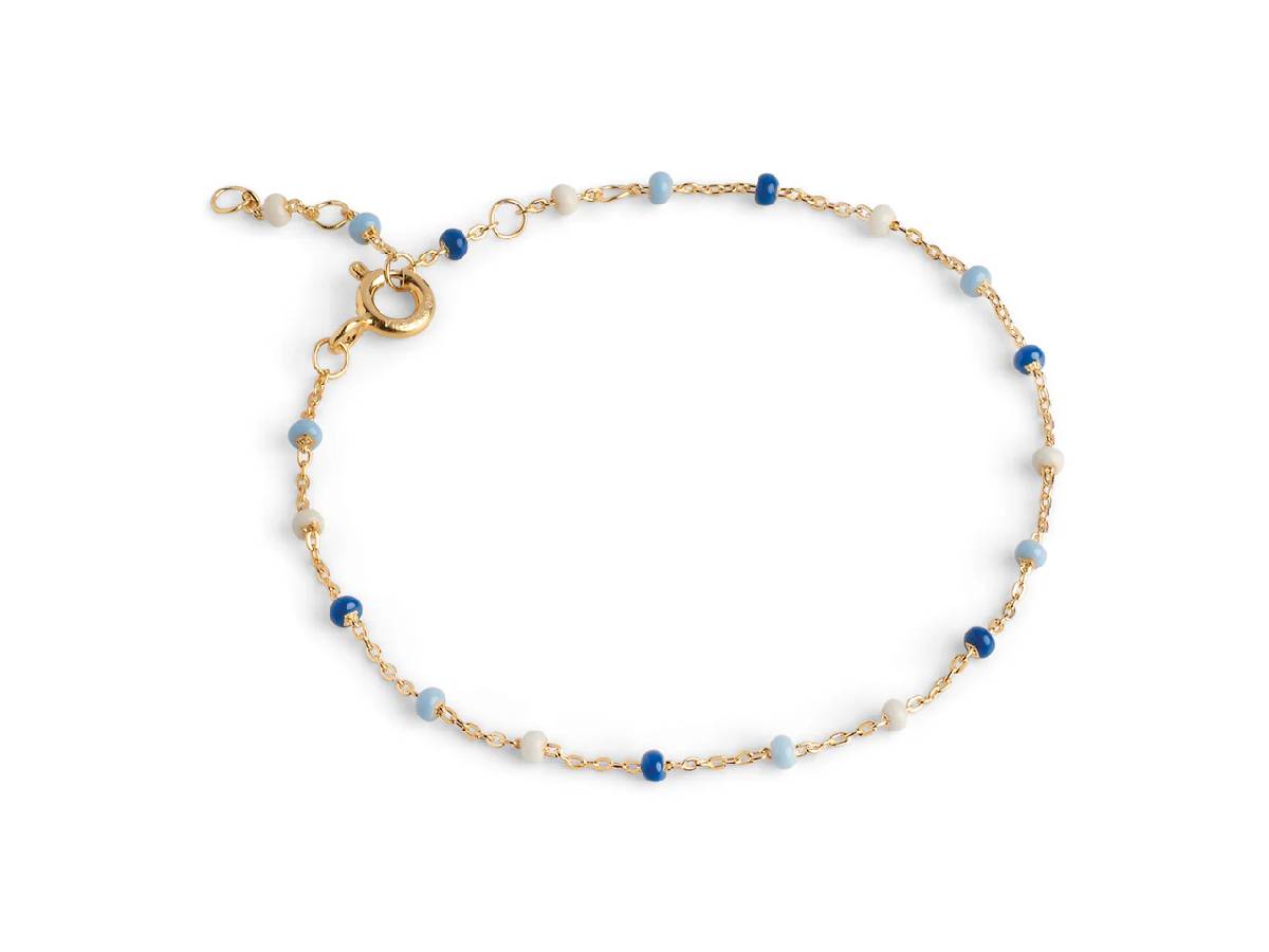 The Lola bracelet consists of a fine chain with small coloured enamels, it is made up of recycled sterling silver and plated in 18k gold. The beautiful range of light blue, dark blue and beige on the enamels is perfect for adding subtle colour to your outfit and can be layered well with other lola bracelets. The colours intentionally mimic that of the ocean waves and clear blue sky.