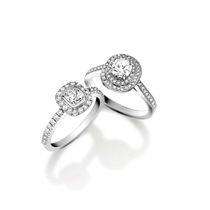 On the left: Platinum handmade centre cushion cut diamond, rubover set, with brilliant cut diamond halo and shoulders showing designer fishtail settings. On the right: Please enquire for more details