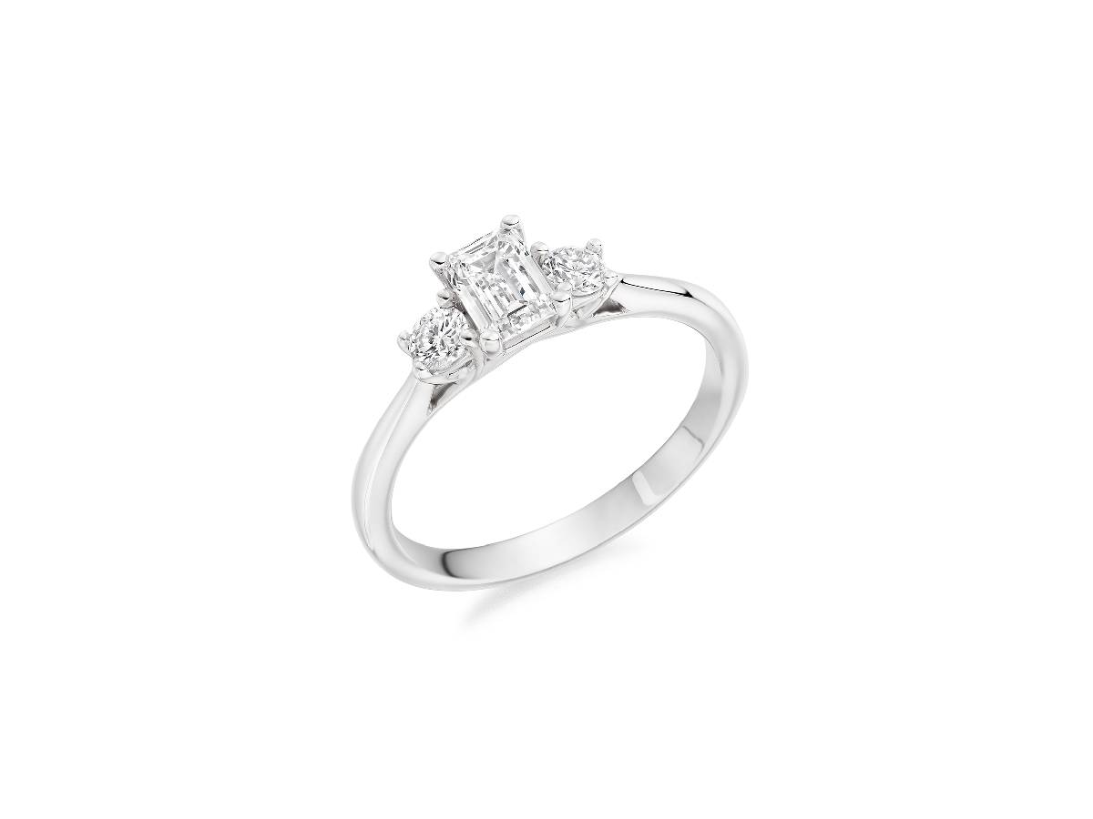 Comprising centre emerald cut diamond, four claw set with one brilliant cut on each shoulder.