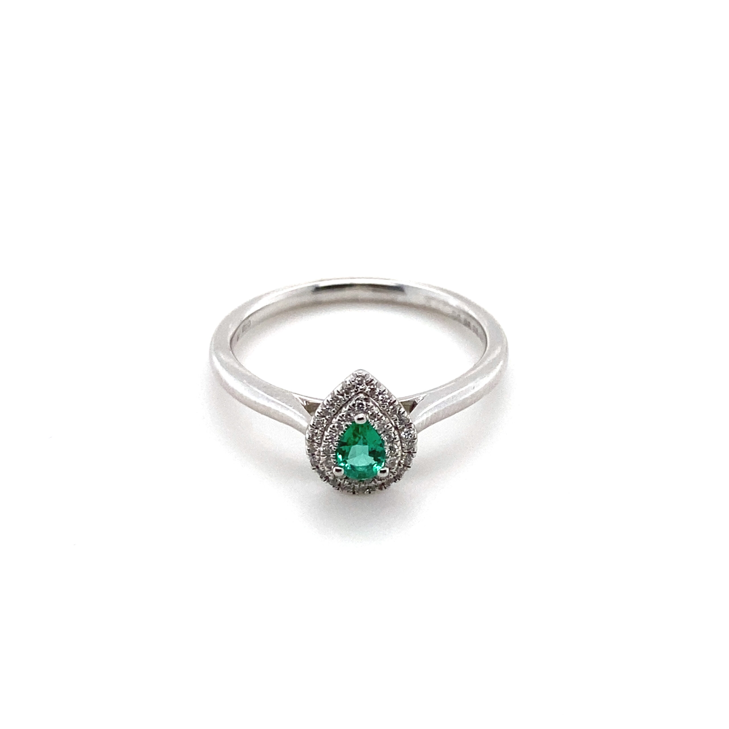 Comprised of a central pear shaped emerald set by 3 claws and surrounded by diamonds. In a double halo design all micro claw set on a platinum mount.