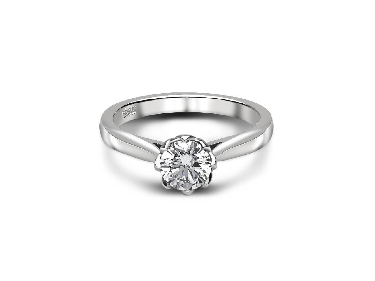 Comprising a beautiful round brilliant Diamond in an 8 claw setting with a petal style collet.