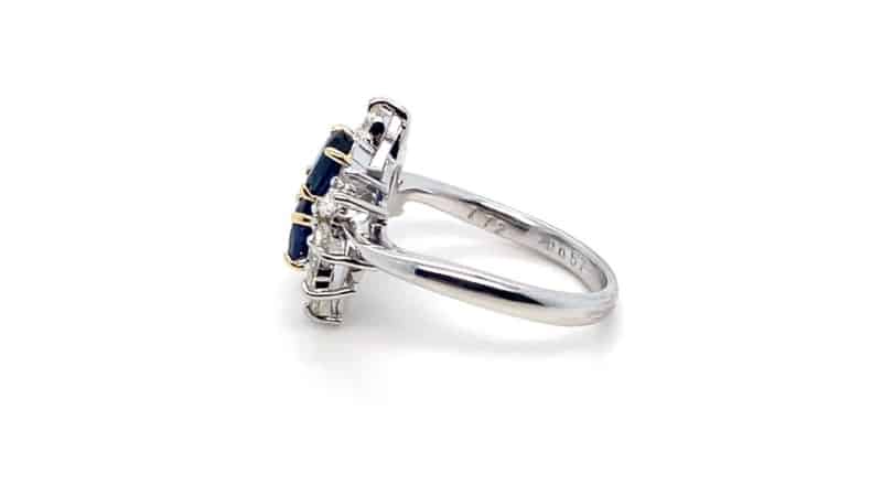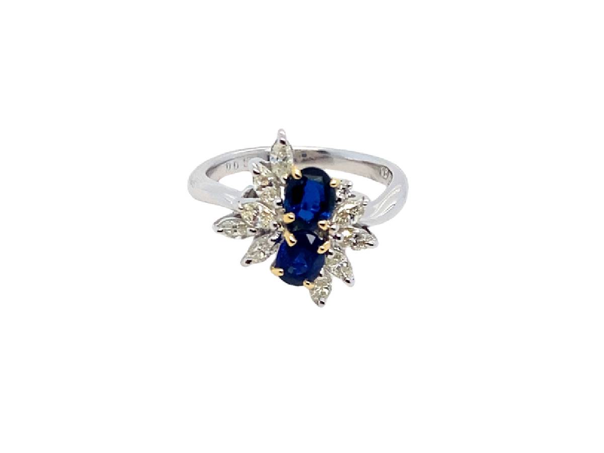 A gorgeous platinum sapphire and diamond cluster ring, comprising of two oval cut sapphires with an array of marquise diamonds surrounding them.