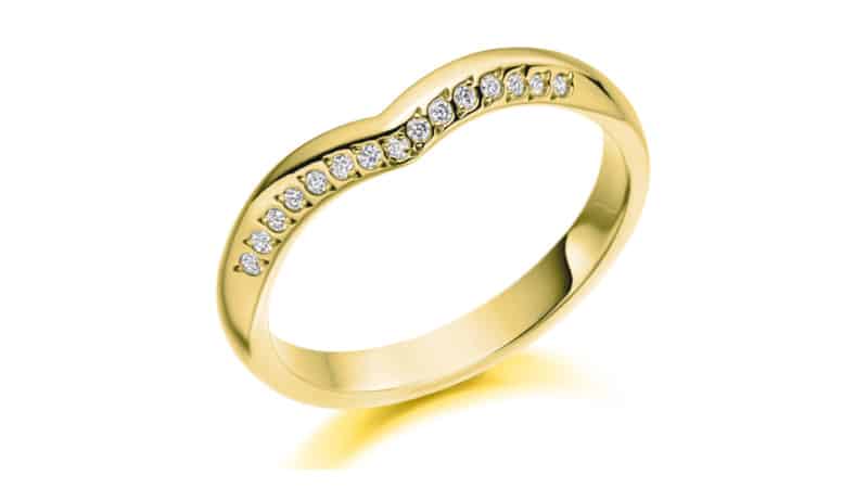 2.7mm wide, brilliant cut diamonds, 33% set to side of shaped ‘V’, grain set shaped wedding ring. Priced in 9ct Rose Gold.