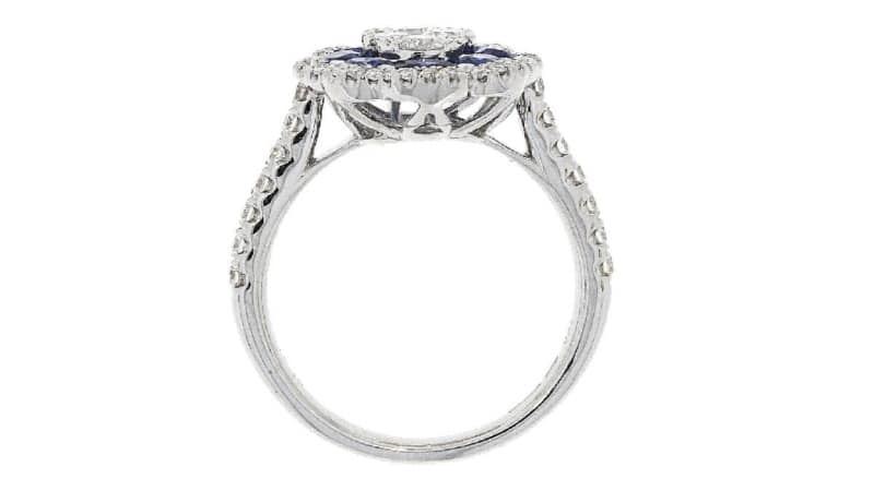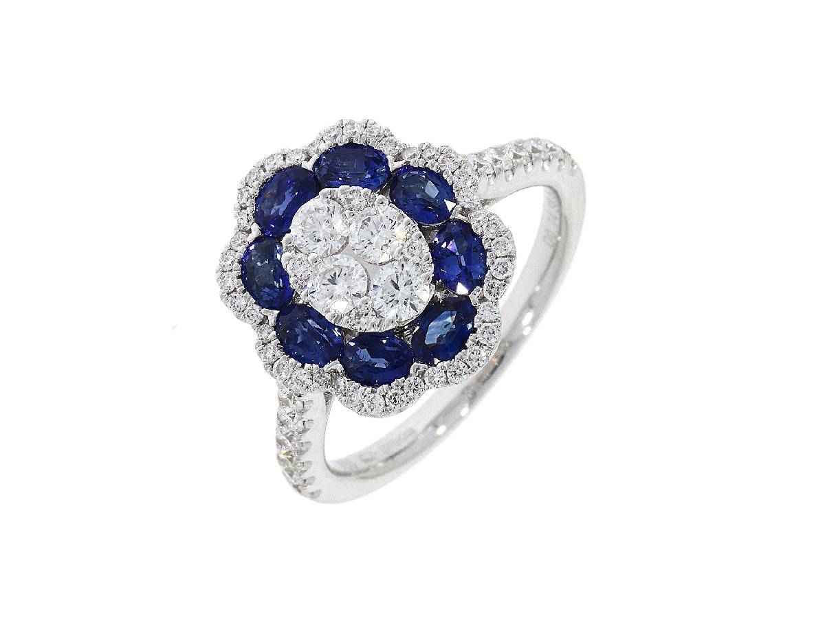 18ct white gold ring. Comprising eight diamonds to centre, illusion set, surrounded by eight oval Sapphires and then a cluster of Diamonds… and the sparkle does not stop there with seven diamonds on each shoulder!