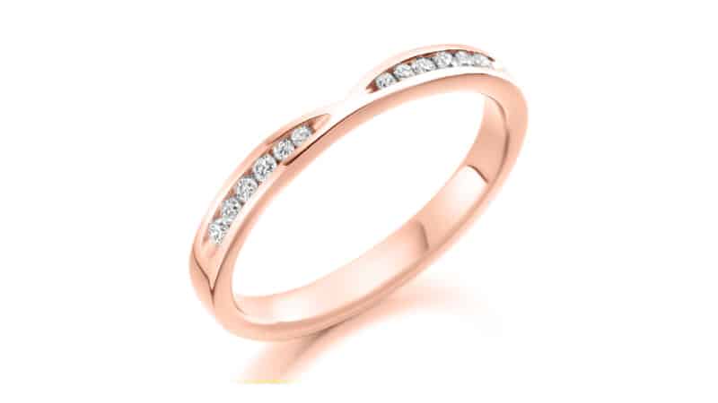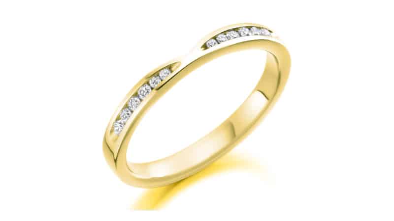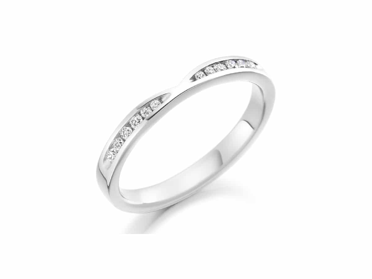 2.6mm wide, brilliant cut diamond, channel set shaped wedding ring with one flat side.