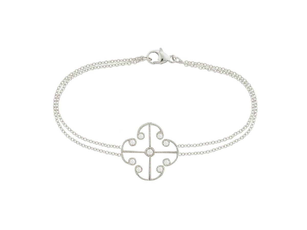 This glamorous, 9ct white gold Lattice bracelet is set with 7 dazzling brilliant cut diamonds. A fine beaded rim setting is attached to a double chain with a polished loop.
