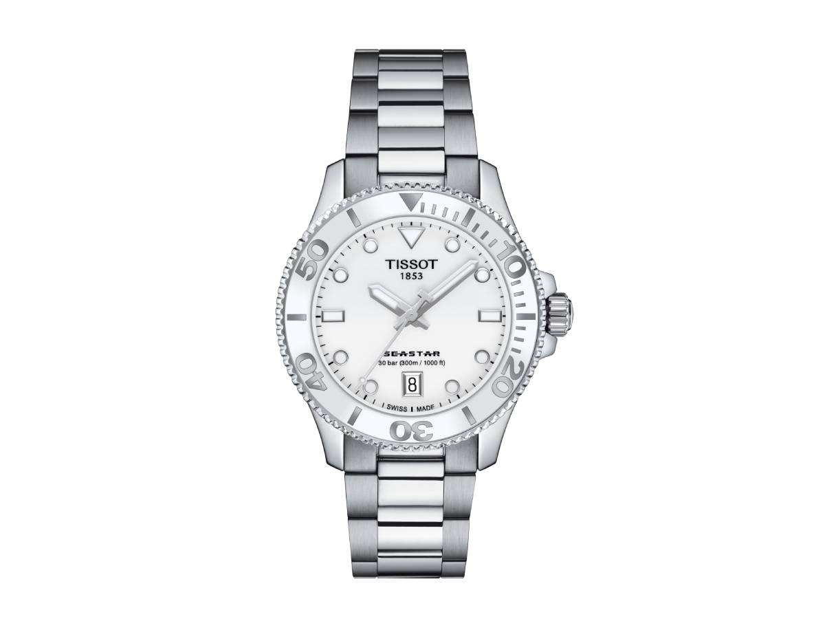 The Tissot Seastar is chic, assertive and versatile whether you choose the black, blue or white dial. Stainless steel case and bracelet, a screw-down crown and water resistance to 300m / 1000ft. If you want, you can quickly switch the bracelet for an orange, white, light-blue or black silicone strap. Change your outlook and step into another world.