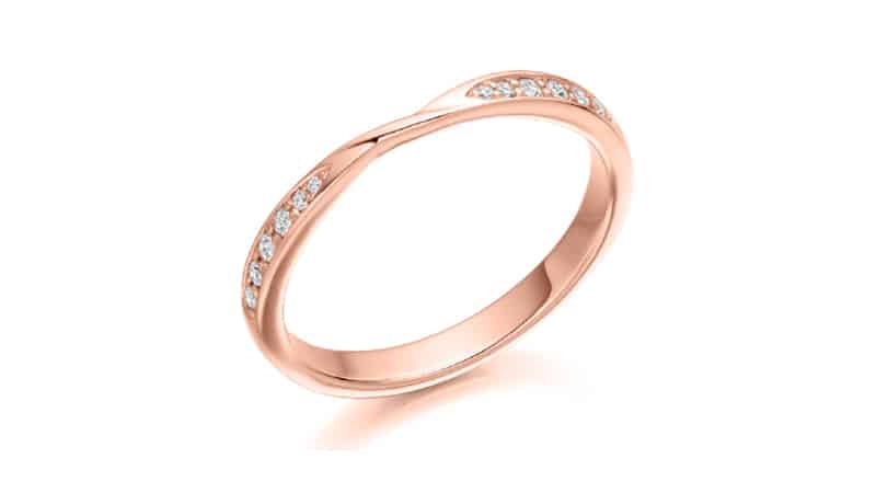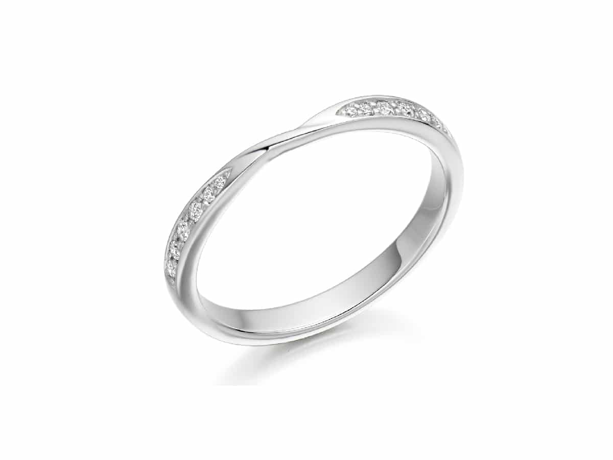 Platinum, 2.5mm wide, tapered brilliant cut diamond, grain set shaped wedding ring with twist.