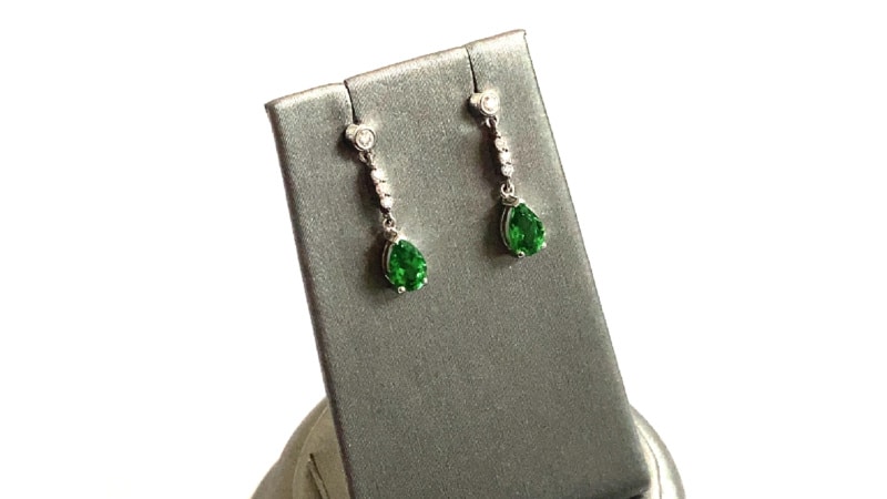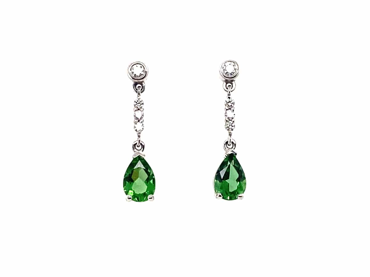 Comprising two beautiful green pear cut Tourmalines with a chevron claw to top and two round to base. There is a single diamond, rubover set to top which holds the post and butterfly and a delicate drop down of diamonds below, micro claw in 18ct White Gold.
