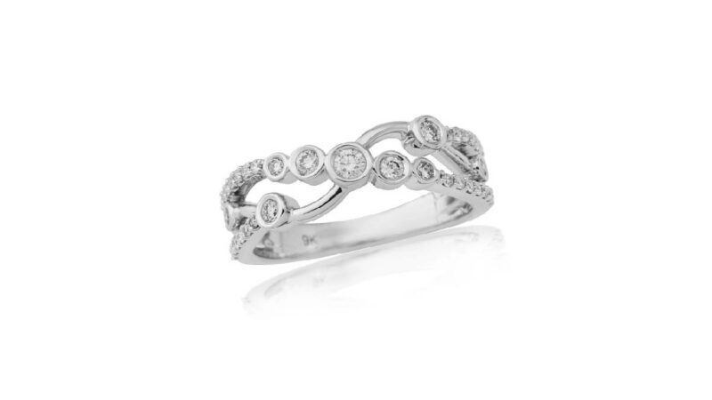Crafted in 9ct white gold, this elegant ring features a playful bubble design with bezel-set round diamonds, framed by pavé diamond accents. The openwork style adds modern flair, making it perfect for everyday wear or special occasions.